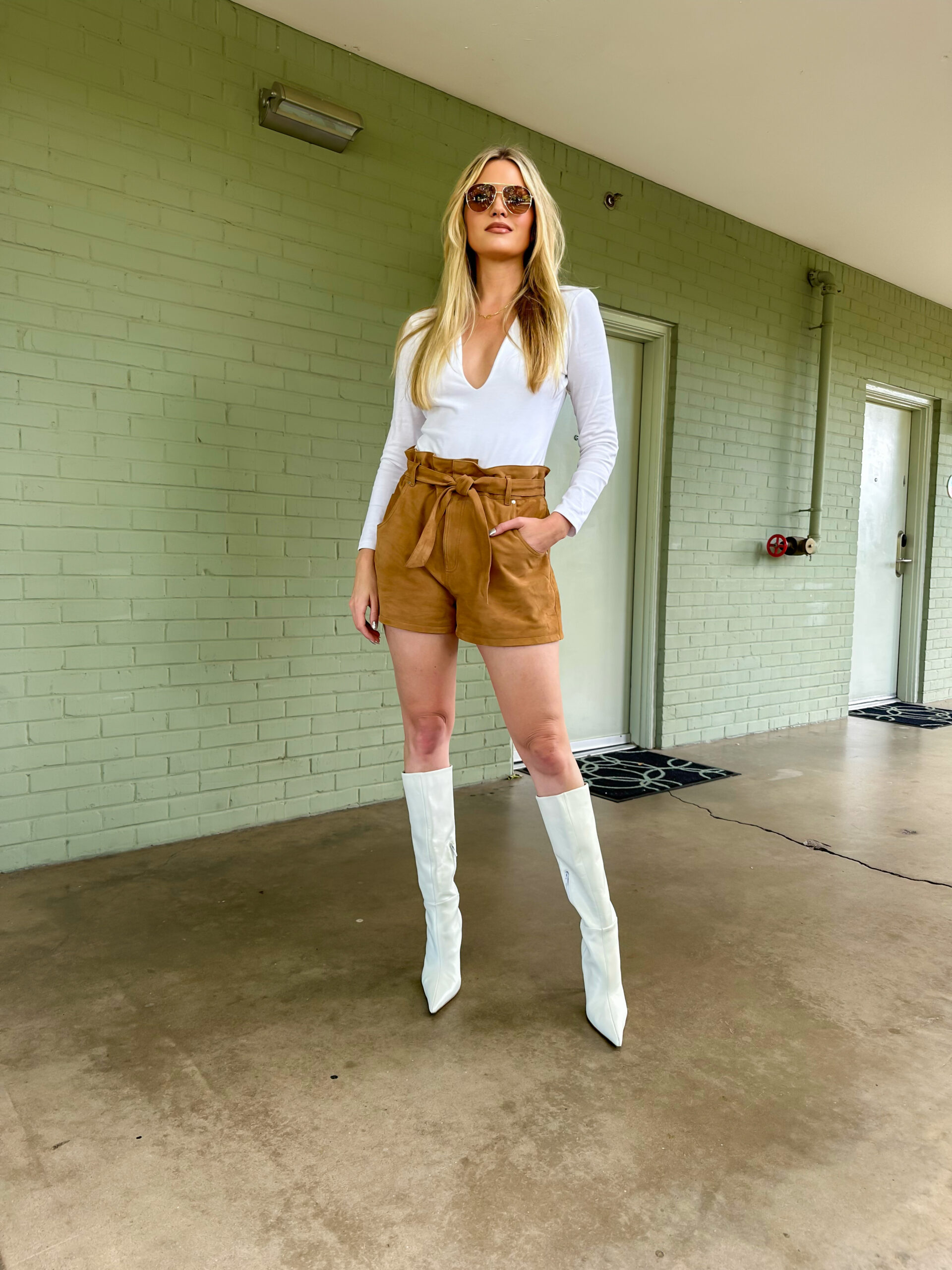 Bodysuit | Suede Shorts | Boots | Sunglasses (on sale for $20)